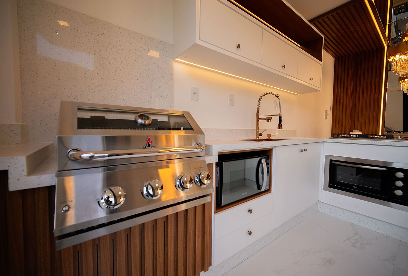 - Eletrodomésticos: geladeira, fogão (cook top), forno micro-ondas, forno elétrico e máquina de lavar roupas;